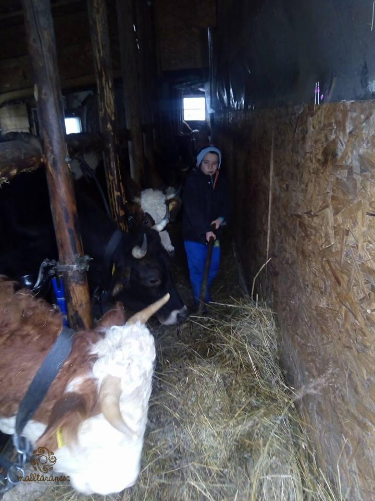 Animalele locuiesc în grajd, au adăpători, deci au apa la discreție. Dimineața și seara, la ore stabilite, le îngrijim: curățăm bălegarul, resturile de fân; apoi le dăm animalelor fân și tărâțe; mulgem văcuțele sau lăsăm vițelușii să pape singuri de la mamele lor. Atunci când sunt afară, există un recipient permanent cu apă la dispoziția lor, iar iarba au cât cuprinde privirea....