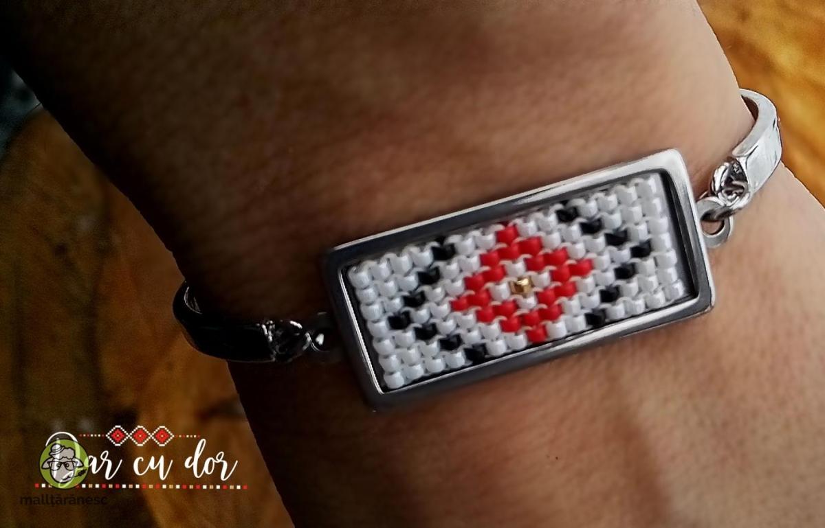 Motiv: romburi cu protecţie, rombul semnificând abundenţa. Culori: negru şi roşu, cu stropi discreţi de auriu. Brăţările cu motive tradiţionale "Dar cu dor" sunt lucrate exclusiv manual din mărgele mărunte şi foarte mărunte, numite şi "mărgele de nisip". Majoritatea lor au motive deosebite de ceea ce se găseşte ca tradiţional la tarabe. Nu sunt reproduceri ale bijuteriilor vechi, ci sunt compuneri noi din motive preluate de pe diverse elemente de artă populară. Câteva brăţări au motive originale. Sunt realizate cu mărgele de calitate, ceea ce se reflectă în ordonarea lor aproape perfectă, care fură privirea. Culorile mărgelelor nu se şterg în timp iar aţa folosită este deosebit de rezistentă. Brăţările "Dar cu dor" sunt ţesute sau cusute. Ţesutul este o tehnică tradiţională românească, în vreme ce tehnica de cusut nu. Aceasta se potriveşte foarte bine elementelor moderne: baze metalice pătrate sau dreptunghiulare ori terminaţii-tub argintate, preponderent din inox. Motivele încastrate în brăţările cu elemente metalice sunt din mărgele foarte fine, cusute fir cu fir. Acestea se potrivesc de minune la ţinute clasice sau elegante. Brăţările cu motive tradiţionale din mărgele "Dar cu dor" sunt potrivite atât la straie de sărbătoare cât şi la ţinute moderne, fiind foarte apreciate de cei care se află peste graniţe şi chiar de către străini, care privesc cu multă admiraţie arta noastră populară. Fiecare brăţară se livrează gratuit pe cartonaş-suport sau în săculeţ organza, ori contracost, în cutie cu suport special, disponibile în categoria Ambalaje. Brăţări din inox, formate din 3 elemente mobile şi prelungitor de 5 cm. Motive tradiţionale geometrice inserate, cusute manual fir cu fir.