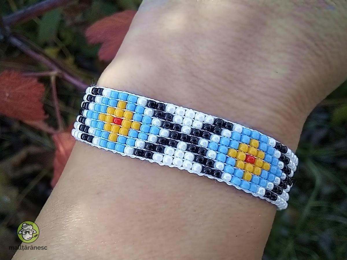 Motiv în culorile drapelului naţional, potrivit a fi purtat atât la ceas de sărbătoare cât şi în orice zi. Brăţările cu motive tradiţionale "Dar cu dor" sunt lucrate exclusiv manual din mărgele mărunte şi foarte mărunte, numite şi "mărgele de nisip". Majoritatea lor au motive deosebite de ceea ce se găseşte ca tradiţional la tarabe. Nu sunt reproduceri ale bijuteriilor vechi, ci sunt compuneri noi din motive preluate de pe diverse elemente de artă populară. Câteva brăţări au motive originale. Sunt realizate cu mărgele de calitate, ceea ce se reflectă în ordonarea lor aproape perfectă, care fură privirea. Culorile mărgelelor nu se şterg în timp iar aţa folosită este deosebit de rezistentă. Brăţările cu motive tradiţionale din mărgele "Dar cu dor" sunt potrivite atât la straie de sărbătoare cât şi la ţinute moderne, fiind foarte apreciate de cei care se află peste graniţe şi chiar de către străini, care privesc cu multă admiraţie arta noastră populară. Fiecare brăţară se livrează gratuit pe cartonaş-suport. Produs realizat cu mărgelele de calitate, cu mărimea de 2mm, în culori vii şi luminoase, şi aţă rezistentă la care s-a adaugat un strop de drag şi pasiune.