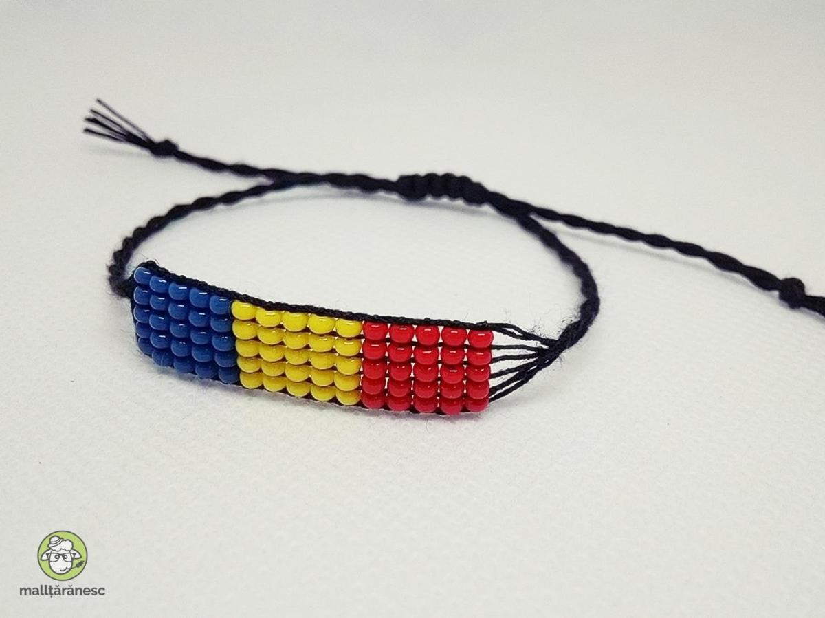 Brăţară-drapel cu şnur negru. Se poate realiza şi cu roşu la cerere. Brăţările cu motive tradiţionale "Dar cu dor" sunt lucrate exclusiv manual din mărgele mărunte şi foarte mărunte, numite şi "mărgele de nisip". Majoritatea lor au motive deosebite de ceea ce se găseşte ca tradiţional la tarabe. Nu sunt reproduceri ale bijuteriilor vechi, ci sunt compuneri noi din motive preluate de pe diverse elemente de artă populară. Câteva brăţări au motive originale. Sunt realizate cu mărgele de calitate, ceea ce se reflectă în ordonarea lor aproape perfectă, care fură privirea. Culorile mărgelelor nu se şterg în timp iar aţa folosită este deosebit de rezistentă. Brăţările cu motive tradiţionale din mărgele "Dar cu dor" sunt potrivite atât la straie de sărbătoare cât şi la ţinute moderne, fiind foarte apreciate de cei care se află peste graniţe şi chiar de către străini, care privesc cu multă admiraţie arta noastră populară. Fiecare brăţară se livrează gratuit pe cartonaş-suport. Produs realizat cu mărgelele de calitate, cu mărimea de 2mm, în culori vii şi luminoase, şi aţă rezistentă la care s-a adaugat un strop de drag şi pasiune.
