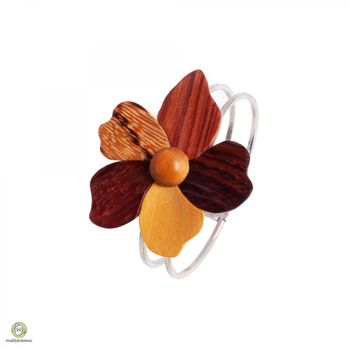 Bratara este realizata prin fixarea unei flori cu centrul din padouk (floare cu cinci petale din esente diferite de lemn exotic : cocobolo, bois serpent,swartzia Bannia,oranger des Osages si rose du Mozambique ) pe suportul metalic care imbraca incheietura mainii.Diametrul aproximativ al florii este de 6,0 cm, iar partea metalica - suportul bratarii este eliptic .Toate esentele folosite au culoare si textura naturala a lemnului. ( Nu au fost folosite substante tip :lacuri, pigmenti, baituri pentru a obtine cele cinci culori la petale .)