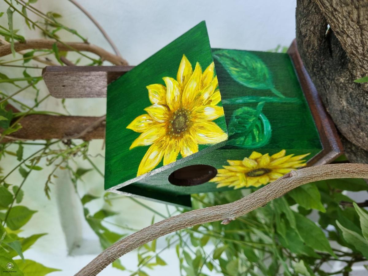 Casute din lemn pentru pasarele,pictata manual cu culori acrilice si lacuita pentru protejarea lemnului.