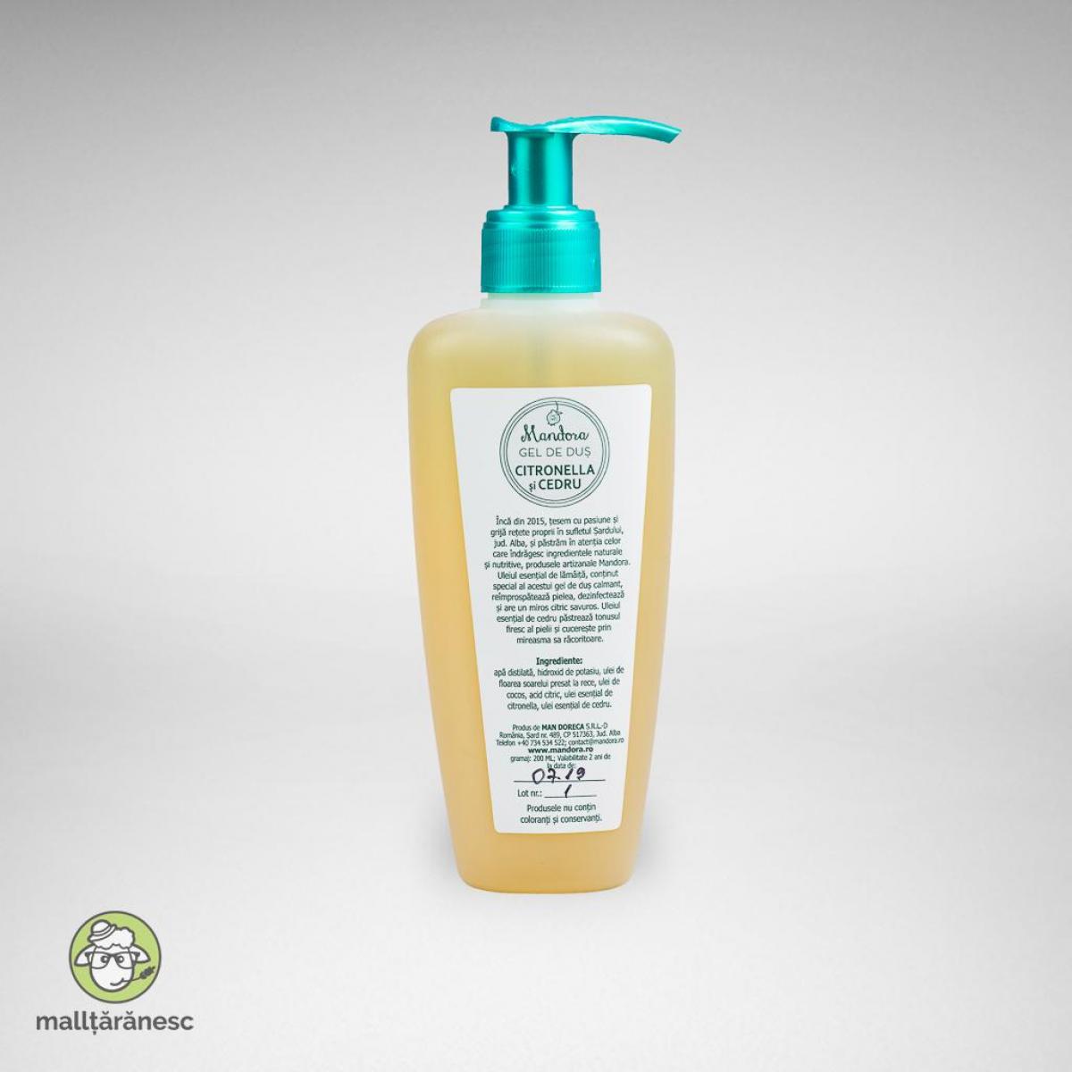 Încă din 2015, țesem rețete proprii în sufletul Șardului, județul Alba, și dedicăm celor care îndrăgesc ingredientele naturale și nutritive, cosmetice produse manual, cu pasiune și grijă. Uleiul esențial de lămâiță, conținut special al acestui gel de duș calmant, reîmprospătează pielea, dezinfectează și are un miros citric savuros. Uleiul esențial de cedru păstrează tonusul firesc al pielii și cucerește prin mireasma sa răcoritoare. Produs notificat U.E. ingrediente: apă distilată, hidroxid de potasiu, ulei de floarea soarelui presat la rece, ulei de cocos, acid citric, ulei esențial de citronella, ulei esențial de cedru