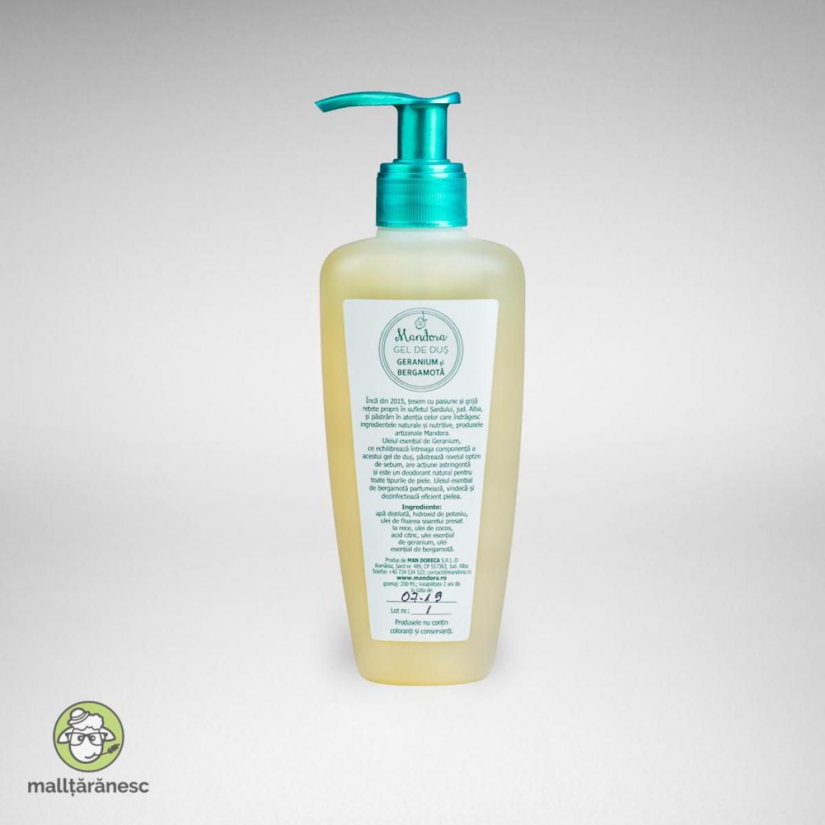 Încă din 2015, țesem rețete proprii în sufletul Șardului, județul Alba, și dedicăm celor care îndrăgesc ingredientele naturale și nutritive, cosmetice produse manual, cu pasiune și grijă. Uleiul esențial de Geranium, ce echilibrează întreaga componență a acestui gel de duș, păstrează nivelul optim de sebum, are acțiune astringentă și este un deodorant natural pentru toate tipurile de piele. Uleiul esențial de bergamotă parfumează, vindecă și dezinfectează eficient pielea. Produs notificat U.E. ingrediente: apă distilată, hidroxid de potasiu, ulei de floarea soarelui presat la rece, ulei de cocos, acid citric, ulei esențial de geranium, ulei esențial de bergamotă