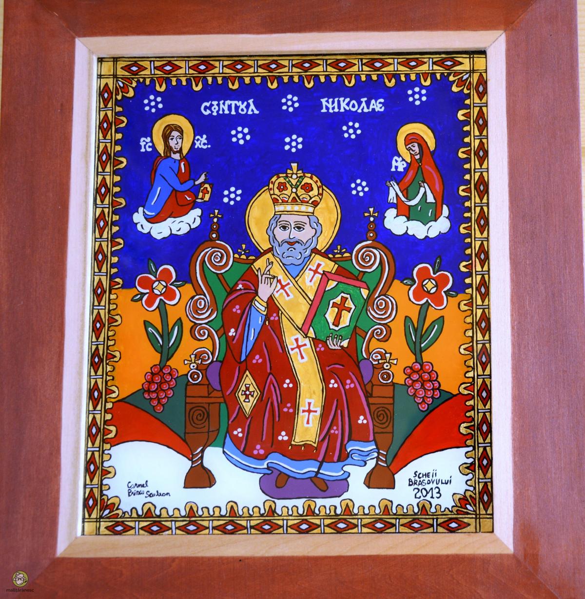 Sfantul Ierarh Nicolae - pictura pe sticla stil de creatie Scheii Brasovului dimensiunea sticlei 25x21 cm