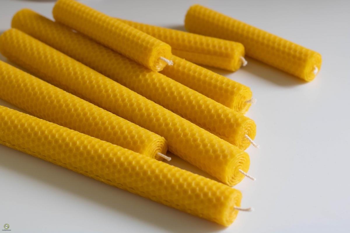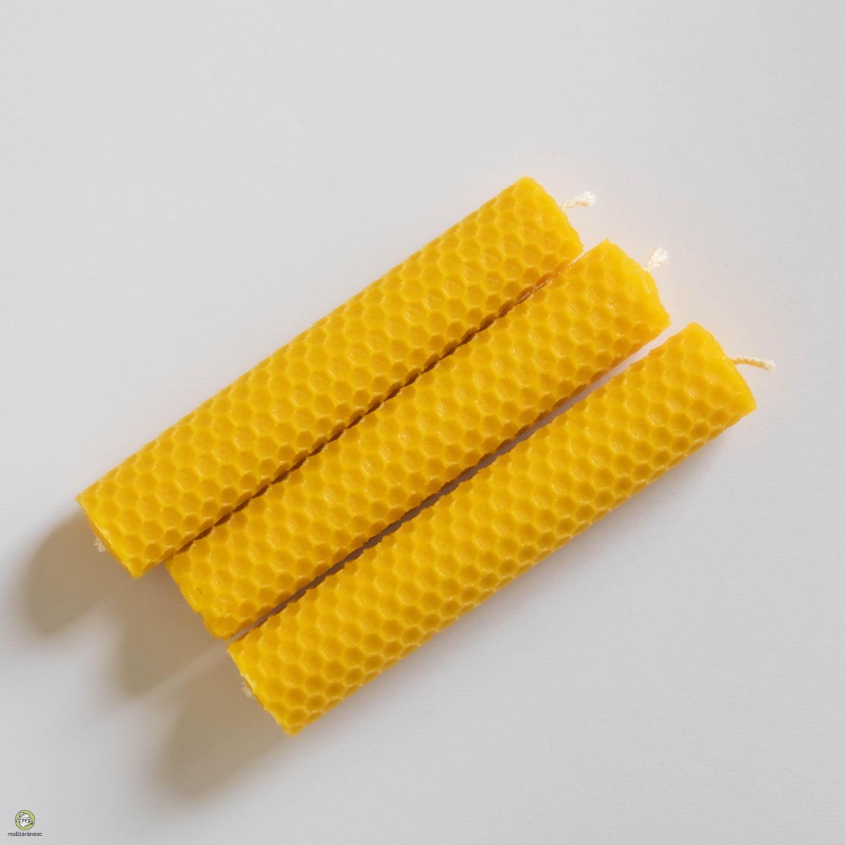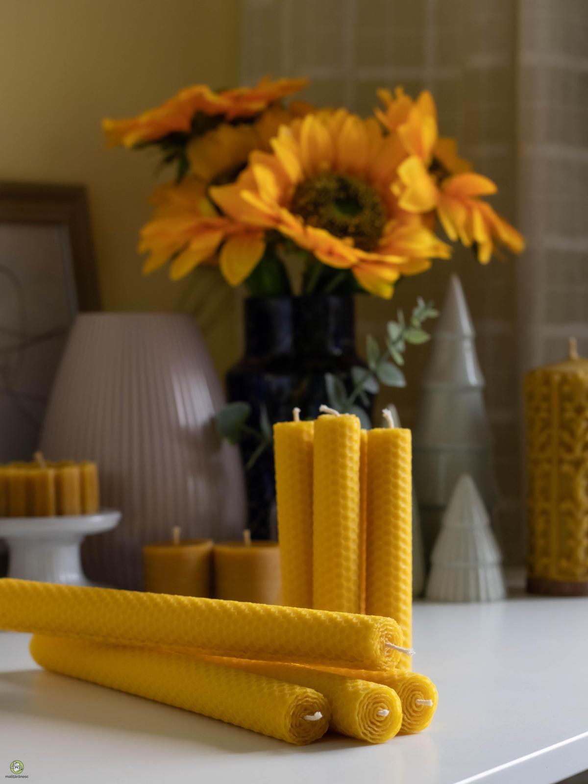 Lucrate manual din ceara de albine 100% pura si fitile din bumbac, lumanarile rulate sunt facute sa dureze. Sunt perfecte pentru evenimente de orice dimensiune si in orice anotimp, inclusiv vara (nu se vor topi). Acestea ard frumos, creand o ambianta calda si sunt perfecte chiar si pentru cei sensibili. Lumanarile din ceara de albine au o ardere curata, fara a produce fum. Timp mediu de ardere: 5-6 ore Greutate: 30-32g Inaltime: 13cm