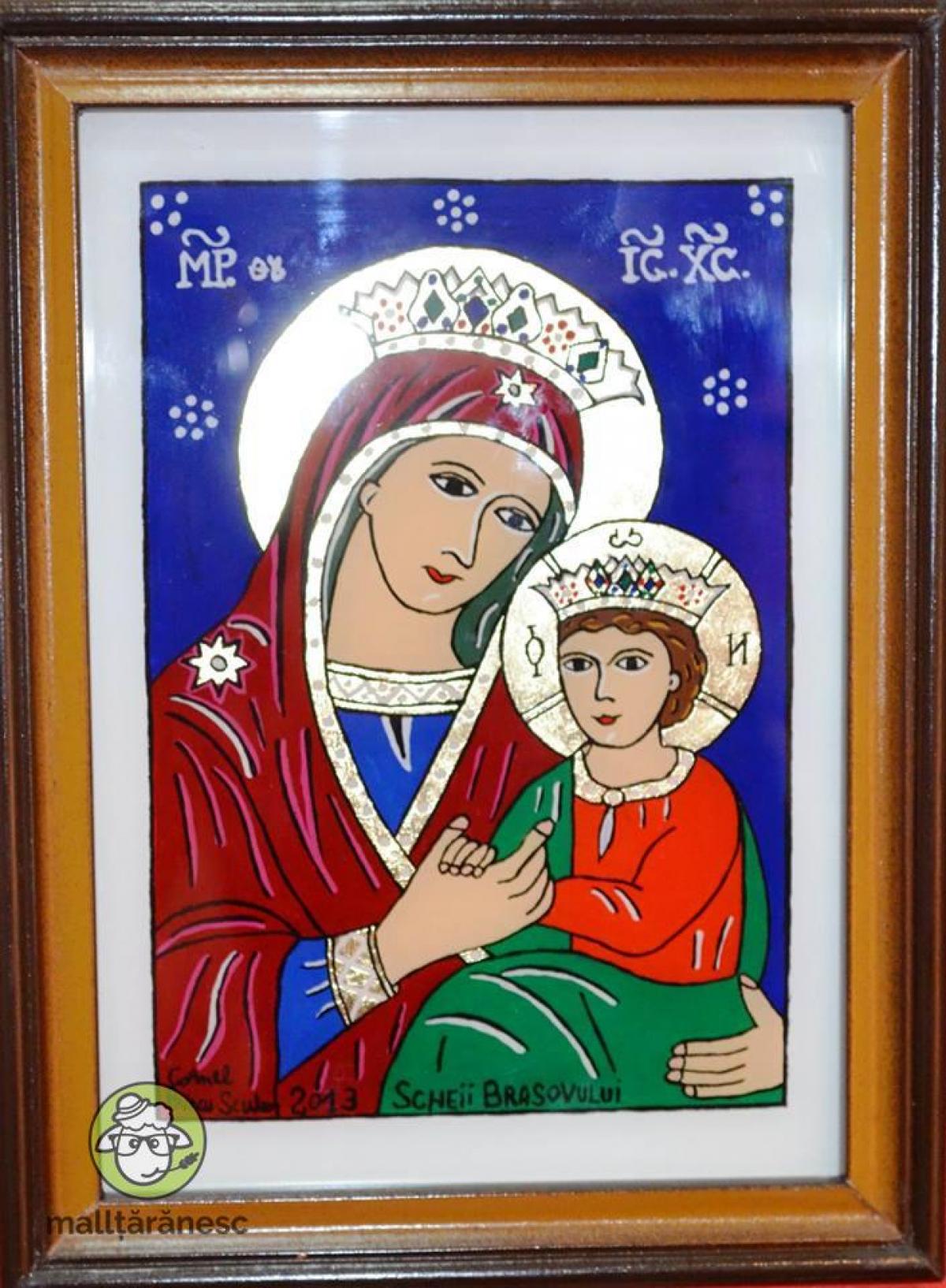 Icoana pe sticla, lucrata in stilul picturii naive specifice zonei Tara Barsei. Marimea sticlei este de 22x16 cm. stil de creatie: pictura pe dosul sticlei in acril si ulei.