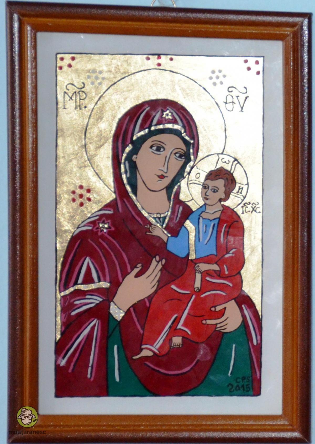 Icoana pe sticla, lucrata in stilul picturii naive specifice zonei Tara Barsei. Marimea sticlei este de 22x14cm. stil de creatie: pictura pe dosul sticlei in acril si ulei.