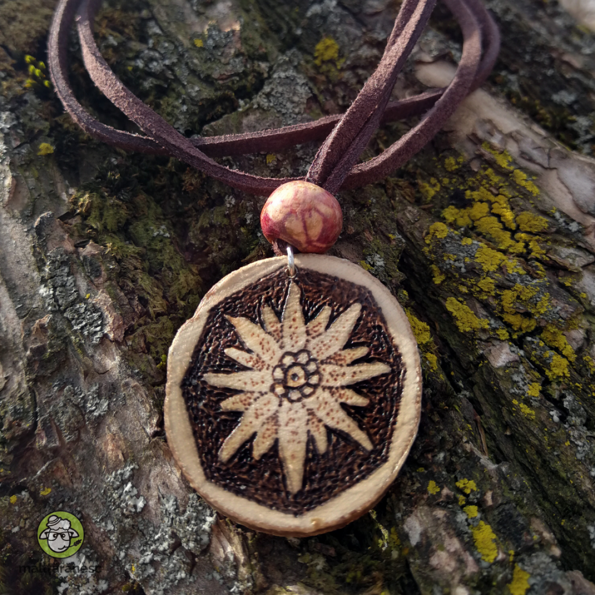 Pirogravură pe felie de lemn reprezentând o Floare de colț, simbolul Carpaților Românești. Florile mici, galbene sunt înconjurate de mai multe petale albe, cu o dispunere stelară. Frunzele, puține la număr, au formă alungită, iar întreaga plantă este acoperită de perișori fini, de culoare argintie, ce au rol de protecție. Floarea de colț poate fi admirată între iulie - septembrie, în zonele stâncoase din Carpați la altitudini mai mari de 1600 m. Este o specie protejată, adaptată climatului alpin. Dimensiunile lemnului sunt de cca 3 - 3,5 cm diametru.