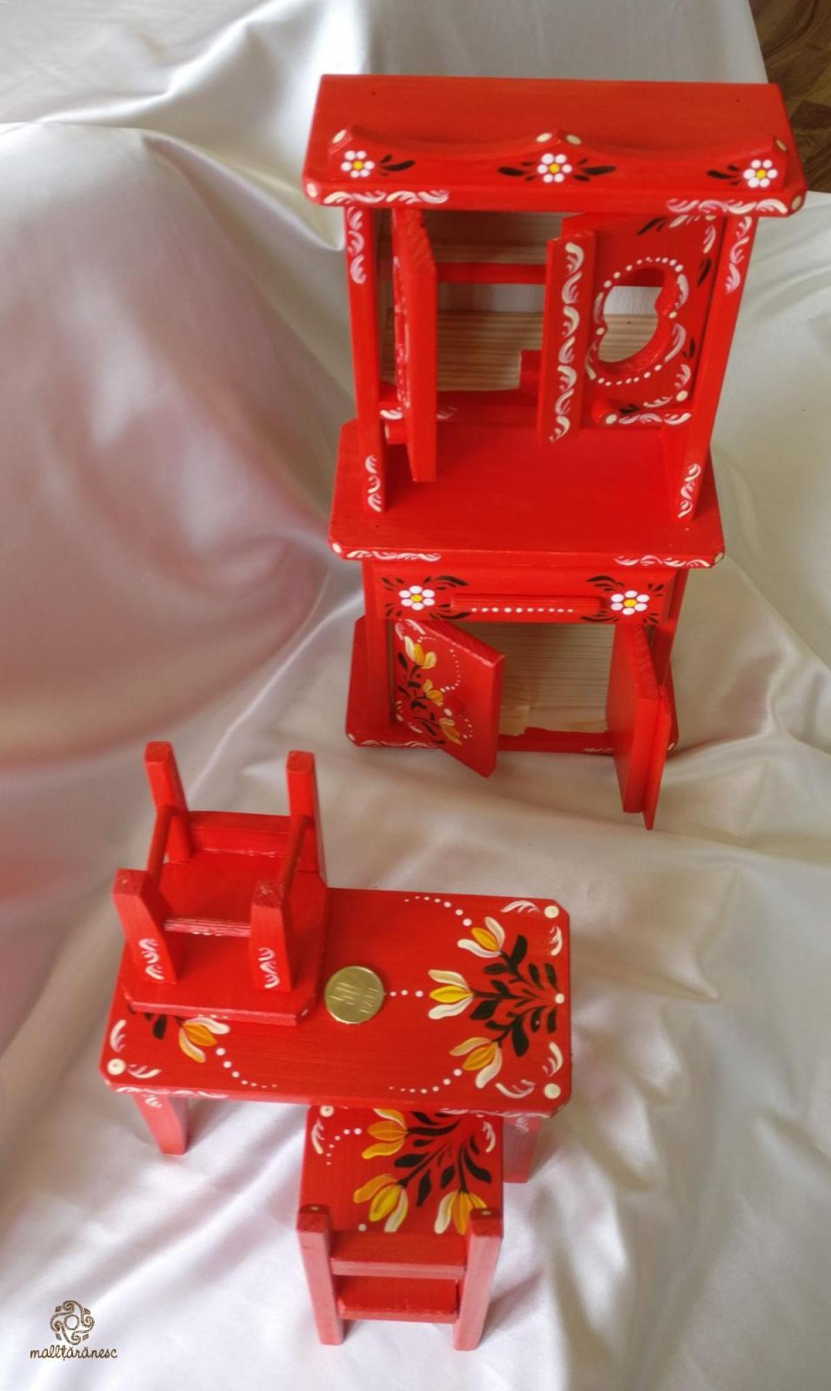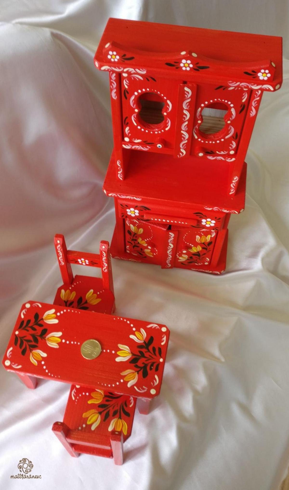 Acest mini mobilier de bucătărie, fabricat din lemn și decorat cu modele tradiționale ardelenesti de către artizanii Zestrea hh, este ideal pentru o căsuță de păpuși din lemn, sau ca și cadou făcut cu o ocazie specială.