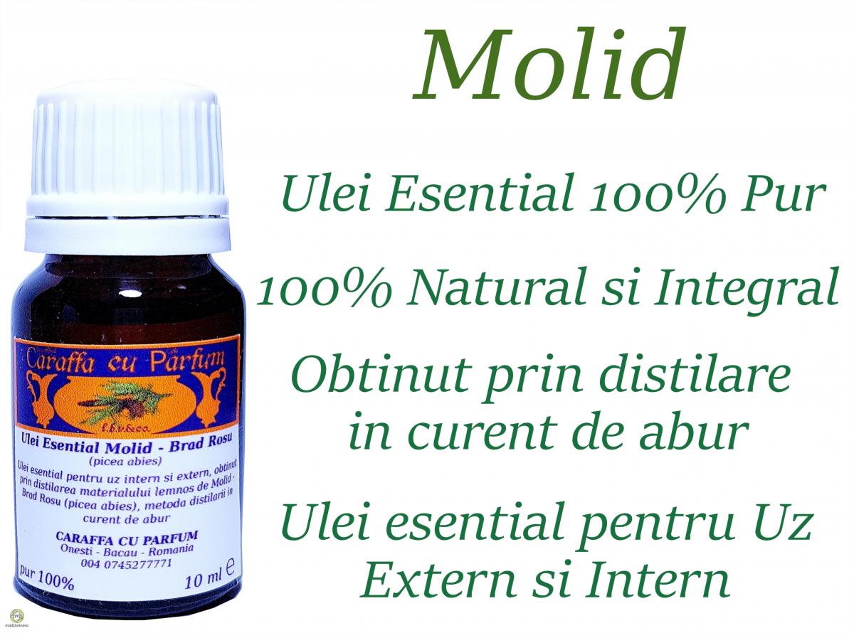 Uleiul Esential de Molid are proprietati terapeutice, analgezic, antimigrenos, calmant al iritabilitatii, carminativ, diuretic, mareste secretia gastrica si peristaltismul intestinal, sudorific, tonic, tonic cardiac, vermifug, calmant (unul dintre cele mai eficiente, valabil si in cazul nevrozelor, depresiilor...), dezinfectant, fluidifiant al secretiilor bronhice, antiseptic general, reglator nervos, antibactericid, antidepresiv, antiseptic pulmonar, antireumatic, antispasmodic, anticonvulsiv, decongestiv.