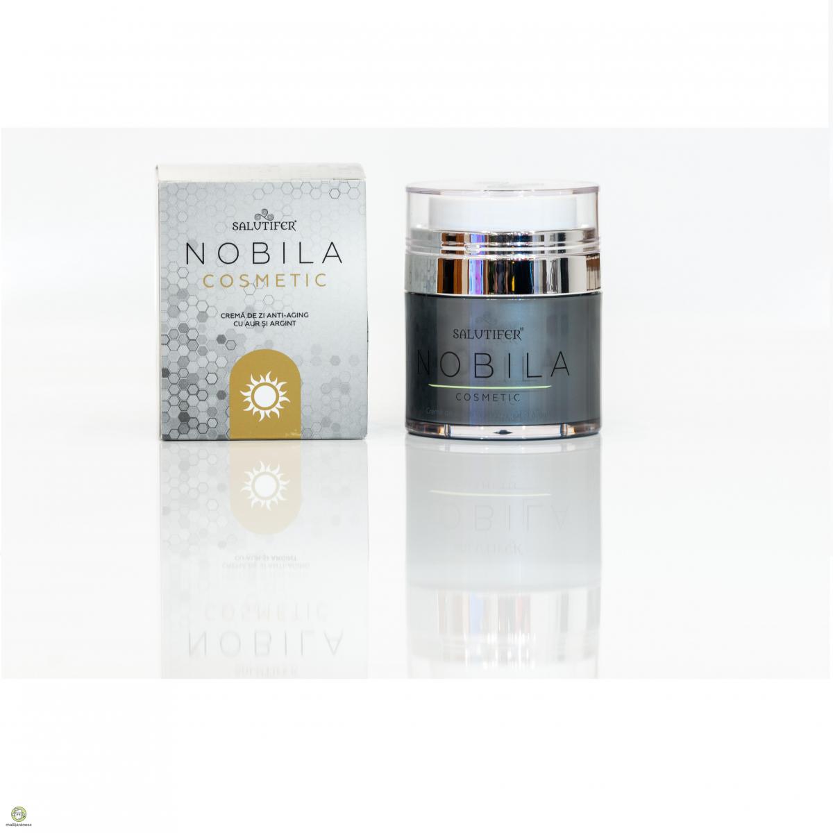 Crema anti-aging cu aur şi argint NOBILA – COSMETIC este o cremă de zi complexă, bogată în ingrediente benefice pentru piele, cu efect hidratant, anti-îmbătrânire, de sporire a fermității și elasticității cutanate. Este potrivită în special pentru tenul matur, uscat sau normal.
