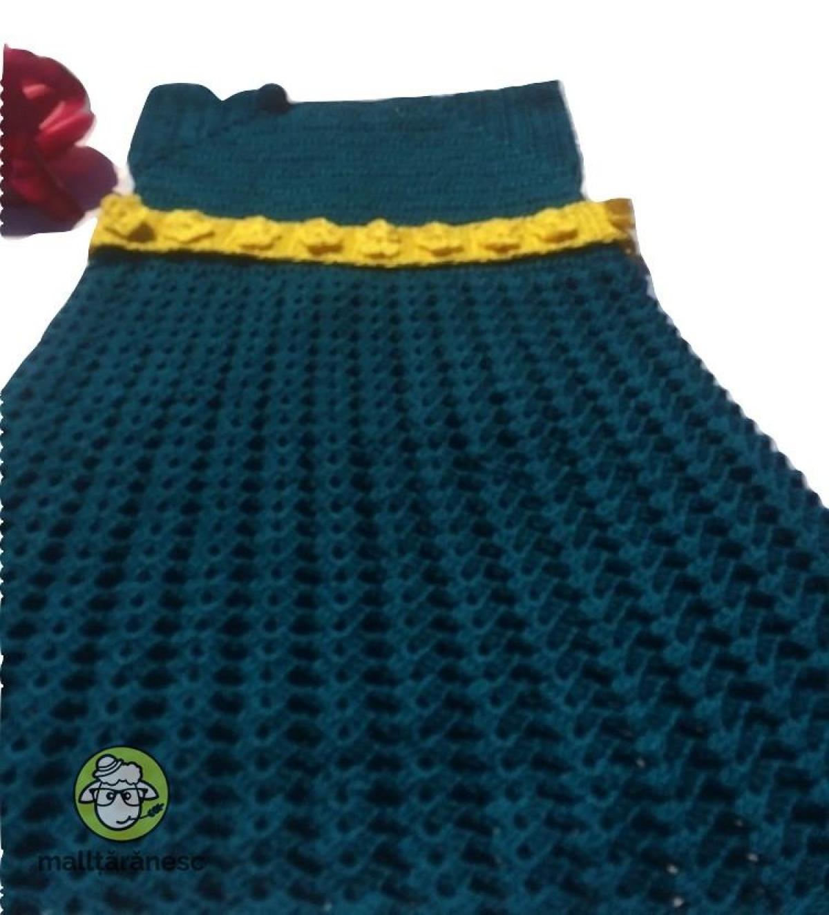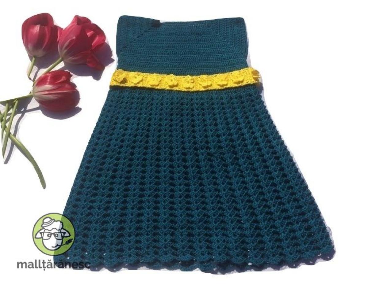 Rochita lucrata manual cu croseta , din fir microfibra, culoare verde smarald, accesorizata cu cordon galben cu flori. Rochita este larga, pentru varsta de 3ani+.Usor de intretinut, rezistenta, lavabil in masina de spalat. Produs in Romania. La comanda se poate executa in culorile si marimile dorite
