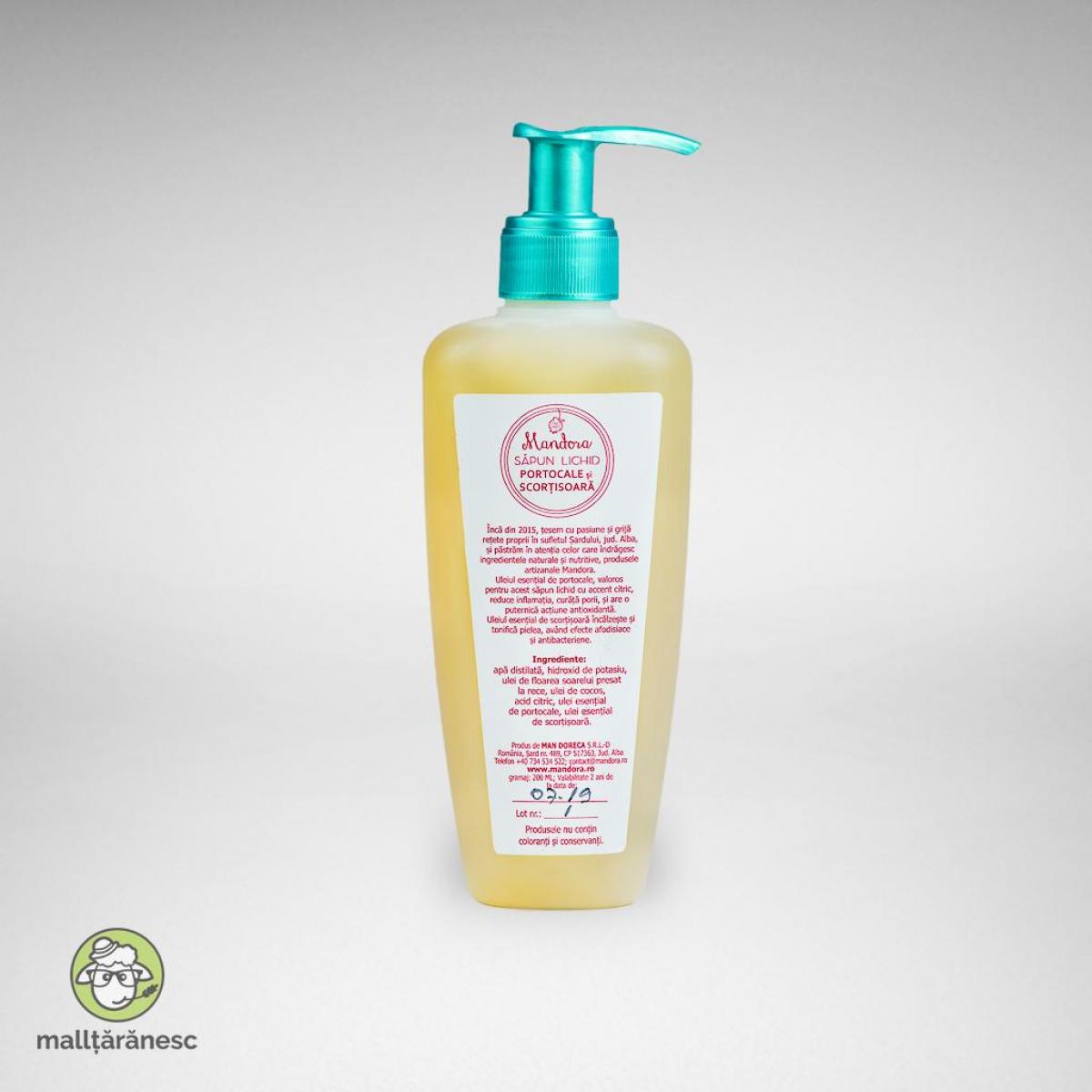 Încă din 2015, țesem rețete proprii în sufletul Șardului, județul Alba, și dedicăm celor care îndrăgesc ingredientele naturale și nutritive, cosmetice produse manual, cu pasiune și grijă. Uleiul esențial de portocale, valoros pentru acest săpun lichid cu accent citric, reduce inflamația, curăță porii, și are o puternică acțiune antioxidantă. Uleiul esențial de scorțișoară încălzește și tonifică pielea, având efecte afrodiziace și antibacteriene. Produs notificat U.E. ingrediente: apă distilată, hidroxid de potasiu, ulei de floarea soarelui presat la rece, ulei de cocos, acid citric, ulei esențial de portocale, ulei esențial de scorțișoară