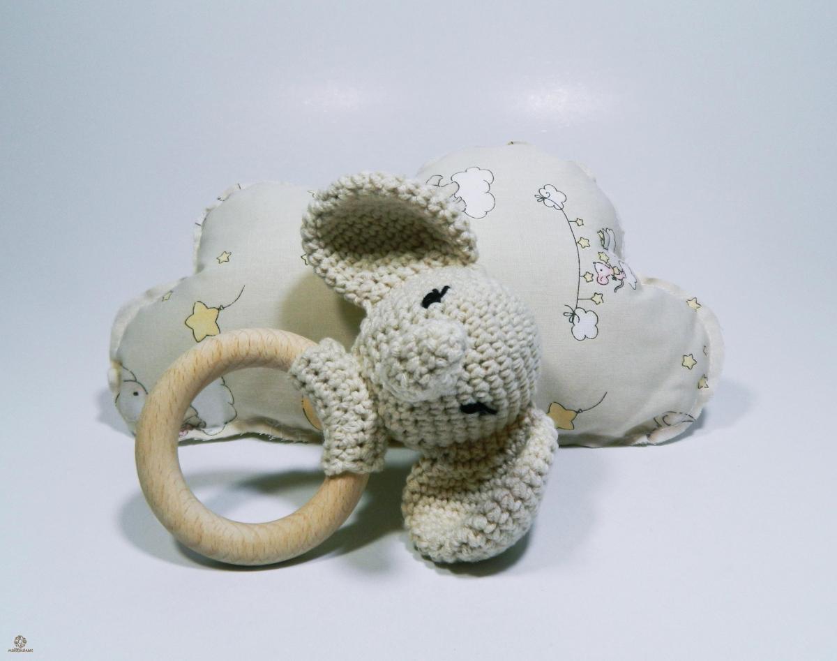 Setul din 2 piese pentru bebelusi este cadoul perfect pentru puiul ce tocmai a sosit pe lume. In aceasta cutie draguta are o perna moale special din materiale hipoalergenice care nu ii pot face rau, si o jucarie mica pe inel de lemn. Firul folosit este o compozitie din bumbac si acril proiectat special pentru copii.