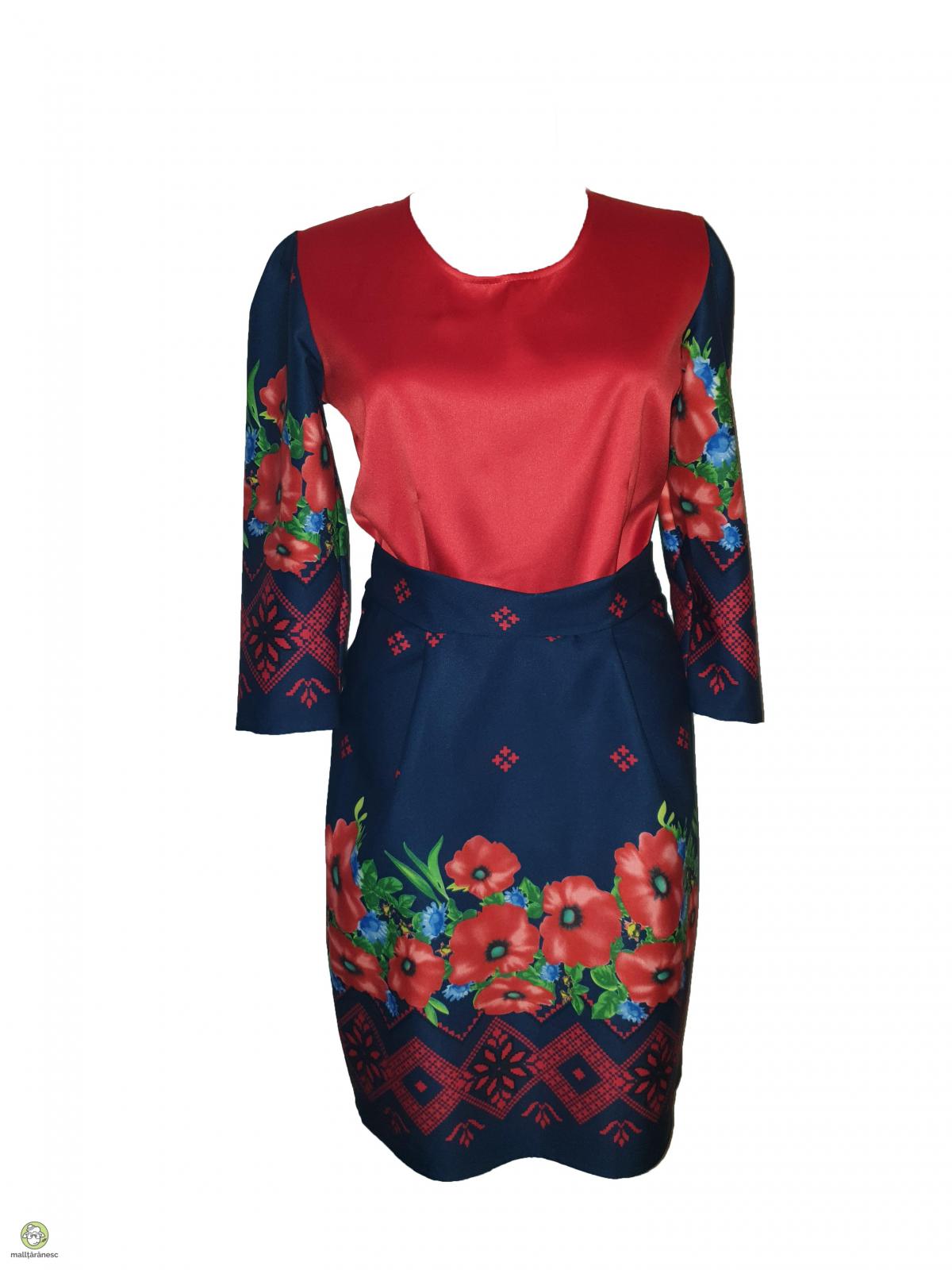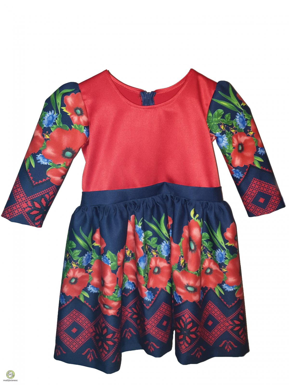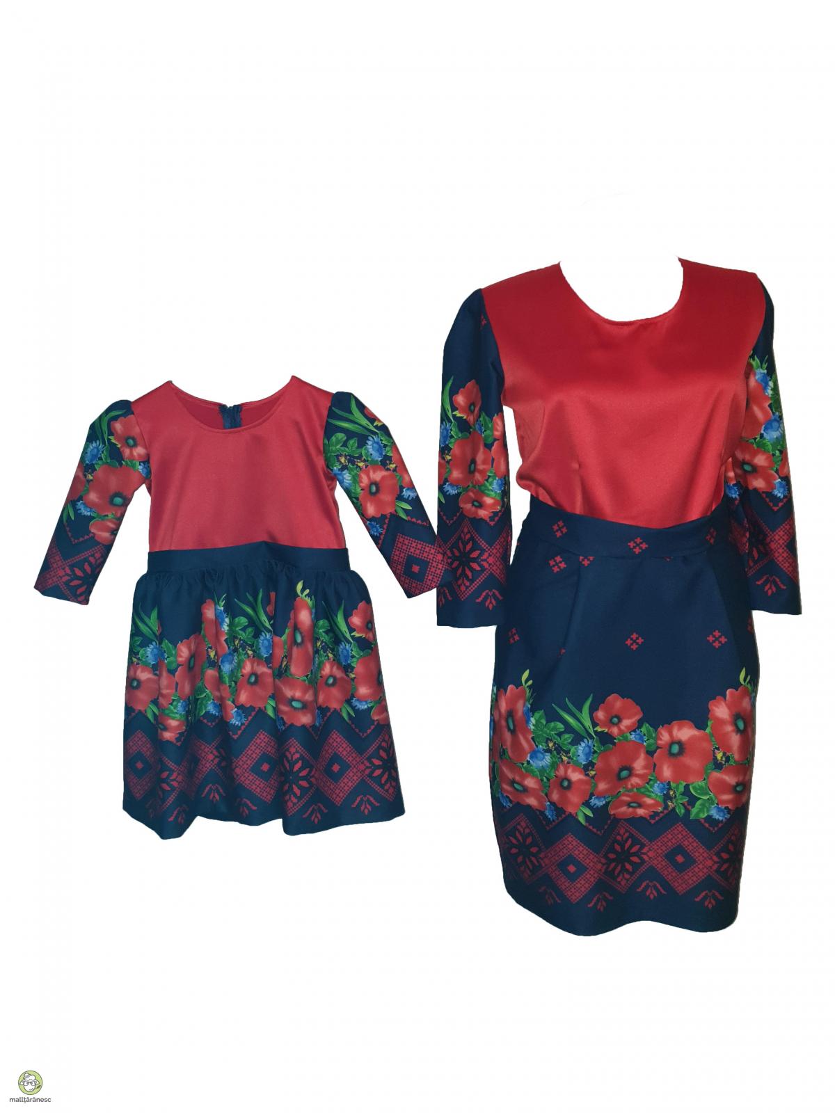 Primavara aceasta, este de rasfat pentru mama si fiica cu o rochie dreapta eleganta scurta din triplu voal imprimat digital, fundal bleumarin cu motive traditionale partea de jos si bustul din tafta de culoare rosie. Rochia eleganta scurta impresioneaza prin design-ul traditional, care confera oricarei purtatoare o aparitie deosebita. Simplu de purtat si accesorizat, rochia scurta este alegerea ideala pentru petrecerile acestei primaveri. Textura deosebit de fina, cu o tinuta fluida. Compozitie rayon cu 2% elastan Intretinere - se spala manual - nu se usuca in masina de spalat - calcare la 40 grade pe spate