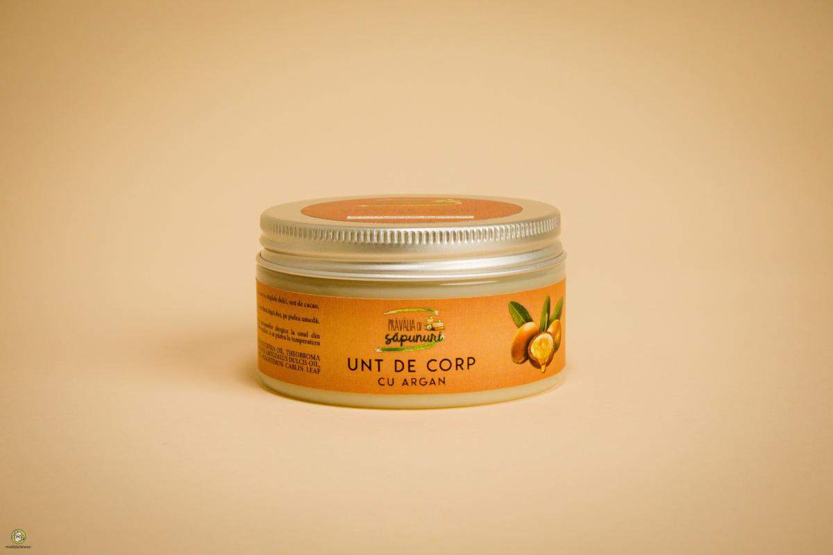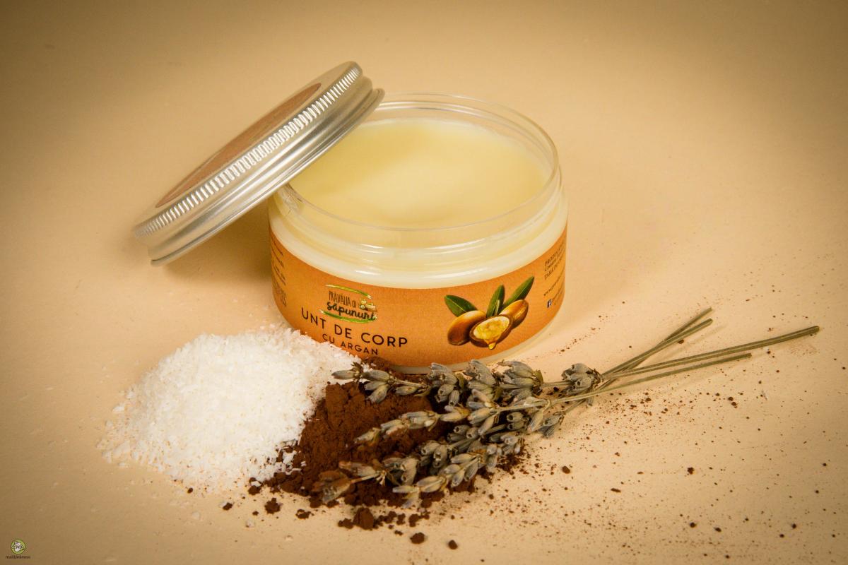 Loțiune nutritivă, emolientă, regeneratoare și hidratantă, ce sporește elasticitatea și suplețea pielii. Uleiul de argan regenerează, hrăneşte şi hidratează pielea, reface bariera hidrolipidică, combate îmbătrânirea cutanată şi contribuie la reducerea celulitei. Este ideal pentru tratarea eczemelor, cicatricilor sau arsurilor de pe piele. Este eficient și în tratarea vergeturilor în special cele de pe burta femeilor gravide. Untul obţinut din boabele de cacao este una dintre cele mai stabile grăsimi vegetale. Conferă excelente proprietăți nutritive și emoliente. Untul de Shea hrănește pielea cu vitaminele A, E și F. Acestea contribuie la menținerea sănătății pielii, ajutând-o să rămână fină și sănătoasă. Aceste vitamine fac minuni pentru persoanele a căror piele a fost afectată de expunerile repetate la soare. Reușește să estompeze petele astfel apărute. Uleiul de cocos este un produs de înfrumuseţare datorită proprietăţilor sale antibacteriene şi antifungice. În plus este un produs hidratant şi foarte grijuliu cu epiderma noastră. Tocoferolul sau vitamina E este esențială pentru sănătatea pielii. Ingrediente (INCI): BUTYROSPERMUM PARKII BUTTER, COCOS NUCIFERA OIL, THEOBROMA CACAO SEED BUTTER, ARGANIA SPINOSA KERNEL OIL, PRUNUS AMYGDALUS DULCIS OIL, TOCOPHERYL Mod de utilizare: Se aplică o cantitate mică pe zonele aferente prin masaj uşor şi confortabil, odată sau de două ori pe zi. Cantitate: 100ml ℮ Referinta CPNP: 2860731. Notificat la data: 06.11.2018